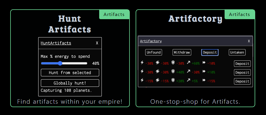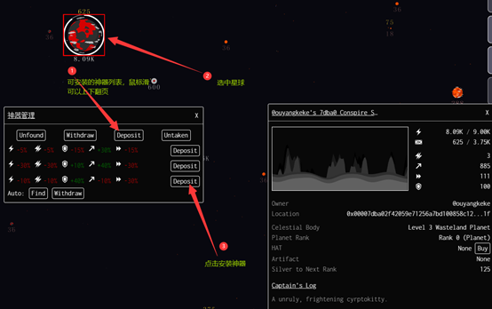 Deposit是选择星球并安装神器,Untaken是显示玩家在领地中尚未被攻占但藏有神器的星球。