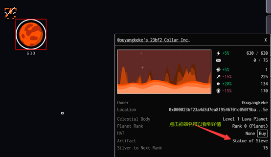 感叹号代表发现可以产出Silver,或星球达到升级条件。粉色以太坊Logo代表链上交易失败,需要重新操作。