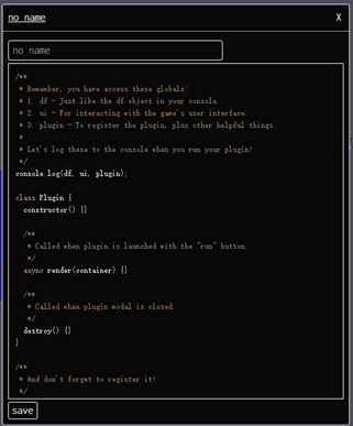 把这部分代码拷贝,覆盖游戏添加插件中显示的代码,给插件取个名字,点击“save”保存。然后再次打开后,点击“run”即可开始使用插件。