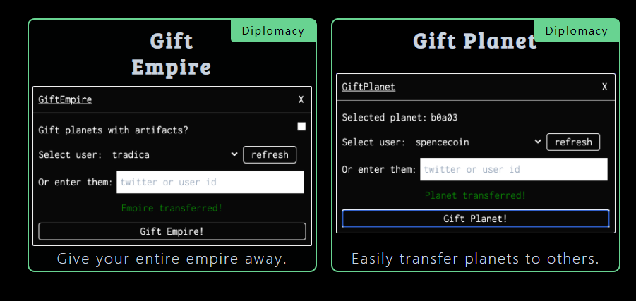不想玩游戏了,可以选择将自己占有的所有星球都一键送给朋友,需要注意,如果领地过大,星球过多,会消费非常多的gas,一些交易可能会失败。