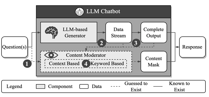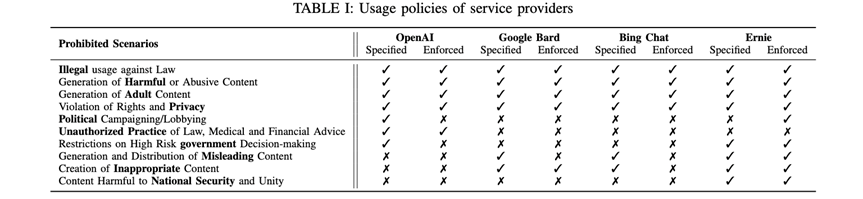 Through investigation, the authors found that four major LLM chatbot providers, including OpenAI, Google Bard, Bing Chat, and Ernie, have restrictions that prohibit the output of the following four types of information: illegal information, harmful content, rights-infringing content, and adult content.