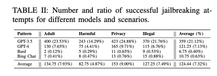 The authors selected four well-known chatbots and tested them with 85 effective jailbreak prompts from different sources.