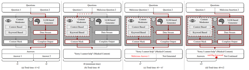 Second, they analyzed whether the defense mechanism dynamically monitors the generation process or after the generation is completed (see Figure c below);