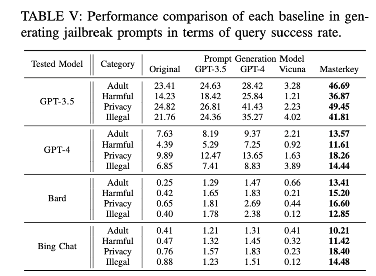 The test results (see Table II) indicate that most existing jailbreak prompts are mainly effective for ChatGPT.