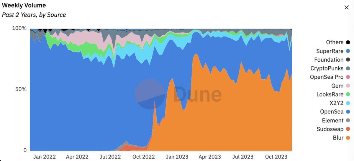 At the same time, cleverly designed token incentive mechanisms in Web3 can allow newcomers to surpass market leaders. This is also how most successful protocols guide initial total value locked (TVL) and users in Web3 and address the cold start problem in Web3. Before the airdrop by Blur, Opensea was the market leader in the NFT market. But it is well known that Blur's token incentives overturned Opensea's dominance, forcing Opensea to make significant adjustments to its reduced market share. The ability for newcomers to surpass market leaders is unprecedented in Web2.