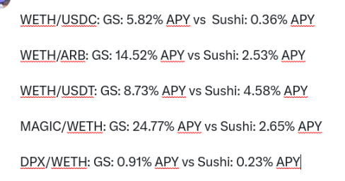 有意思的是,近几周的熟面孔「Gamma Swap」的数据表现尚可,通过 GammaSwap 获得的 Sushi LP 比没有激励措施的直接 Sushi LP 赚得更多,在过去 24 小时内,通过 GammaSwap 获得的 Sushi LP 的收入超过了直接的 Sushi LP。