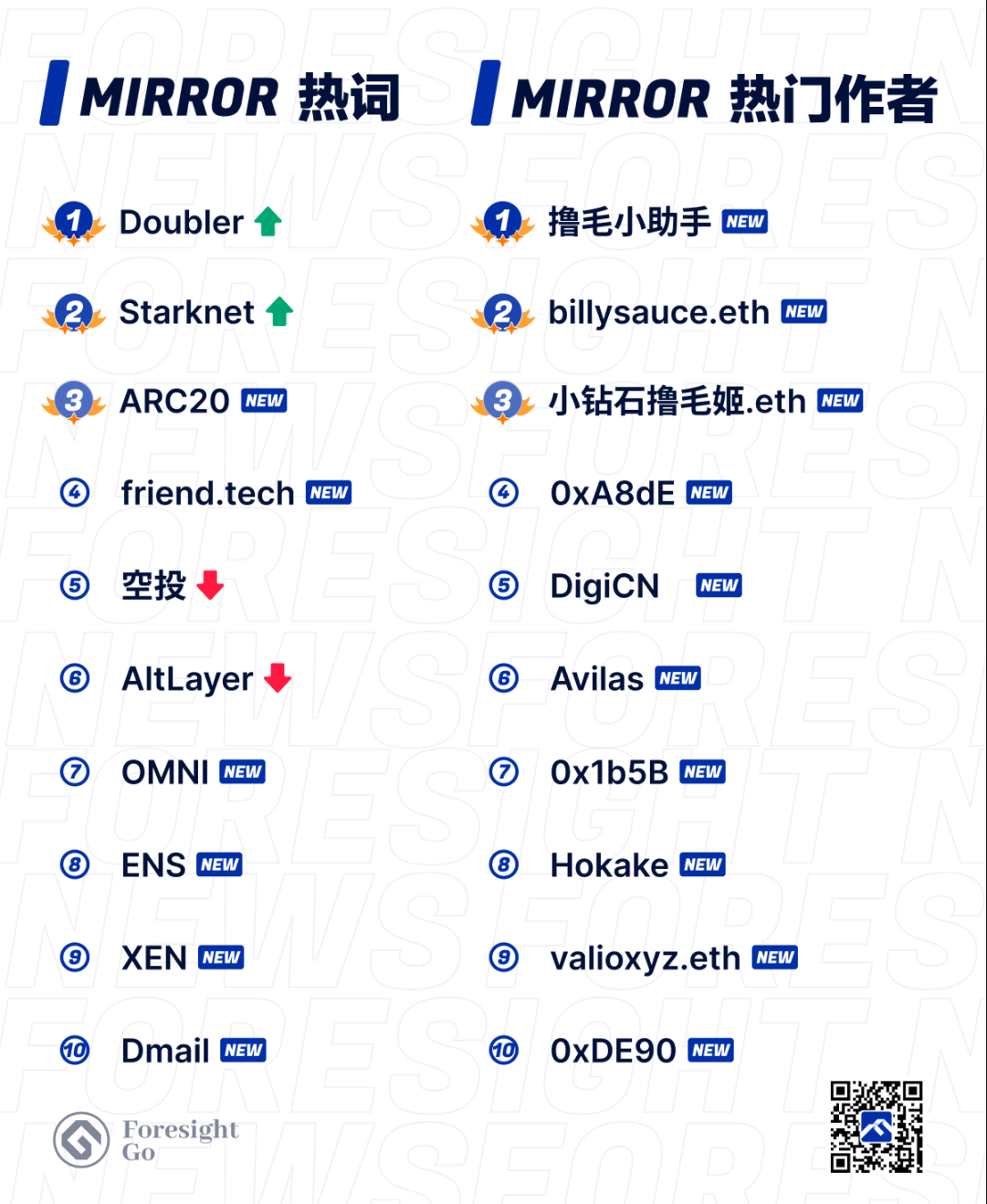 本周 Mirror 热搜榜除了其中的「Doubler」、「Starknet」外,像「ARC20」、「Dmail」等也在本周新上榜,作者榜也全面更新,整体来看作者类别中空投教程类的比例继续下降: