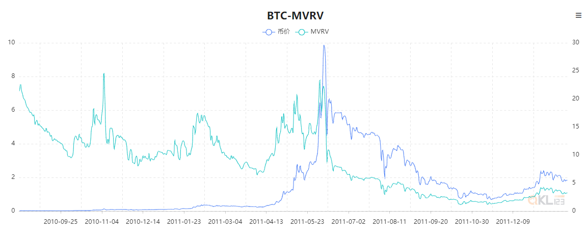 第一个周期期间,特别是在2011年6月牛市之前,MVRV表现极不稳定,大体维持在2-8之间。这是比特币市场早期不成熟的一种表现,一方面市场炒作投机比例大,另一方面是很多链上移动的比特币也表现出极大的不稳定,包括其中有很多比特币可能在此期间发生丢失。随着比特币价格快速下行,MVRV也出现大幅回落,最低降至历史最低点0.4。