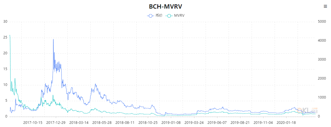 BCH于2017年从比特币社区分裂,牛市之前的BCH-MVRV主要在2-6之间大幅变动,类似比特币早期的表现。牛市过后,BCH-MVRV随着价格波动下降,在2018年底最低降至0.22。在2019年4月一波上涨行情之后,于当年6月底达到1.6的峰值,和LTC-MVRV的表现类似。但目前BCH-MVRV在0.8左右,而LTC-MVRV在0.6左右,也就说比特现金的相对估值要比莱特币高一些,但依然不如比特币。