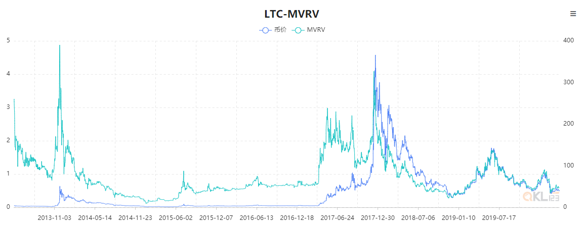 莱特币诞生于2011年11月,相对比特币诞生晚了近三年。2013年期间,LTC-MVRV类似BTC-MVRV在第一个周期的表现,维持在一个较高的水平(1-6之间),但整体水平要低于后者。而且,2015年初和2018年末的熊市低点所对应的LTC-MVRV低至0.1和0.3。但2017年底牛市顶点所对应的LTC-MVRV,却和BTC-MVRV接近。出现这种情况,一方面是因为莱特币的市值相对较小,更容易受到市场情绪的影响,使得LTC-MVRV受价格影响较大,表现出更大的波动性;另一方面是因为市场更认可比特币,莱特币的相对估值偏低,使得LTC-MVRV长期表现出较低水平。