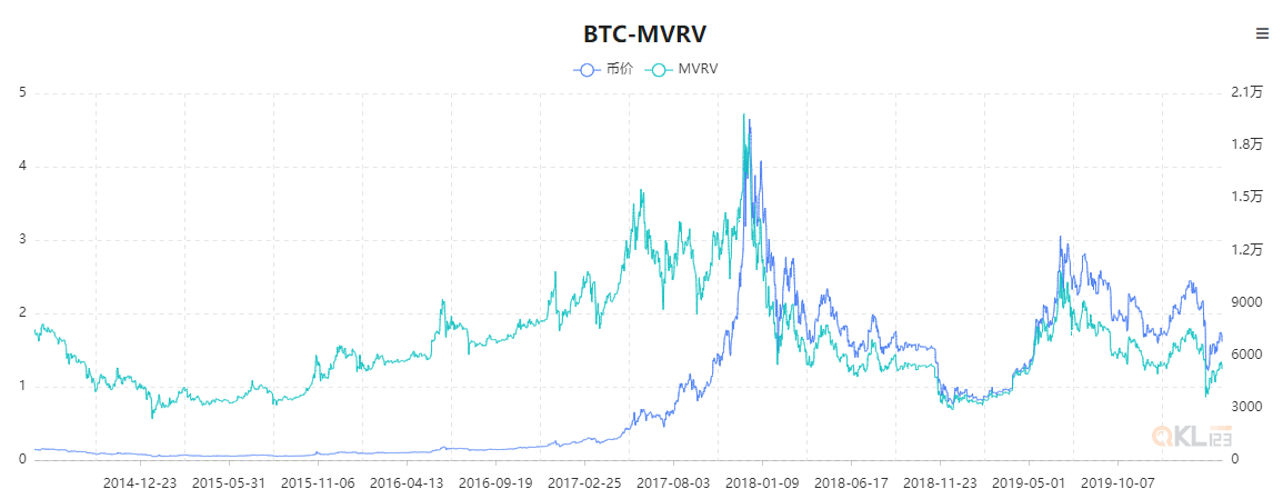 因为RV可以近似的衡量市场上所有比特币持有者的长期成本(极端情况下会有较大偏差),所以在市场对比特币需求不断增长的大背景下,通常会低于MV。RV与MV所差出来的“市值”背后,可能是短期市场上的供给者(抛压带来下行风险),也可能是长期市场上的托底者(或最后的煎熬者)。所以,MVRV比率间接了反映二级市场上比特币供需的失衡程度,进而可以反映市场价格被低估或高估的程度。