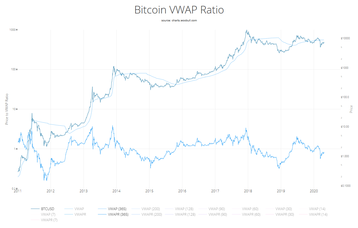 链上VWAP比率(VWAPR)是市场价格与链上VWAP的比值,而链上VWAP可以看作RV的变种。其计算公式如下: