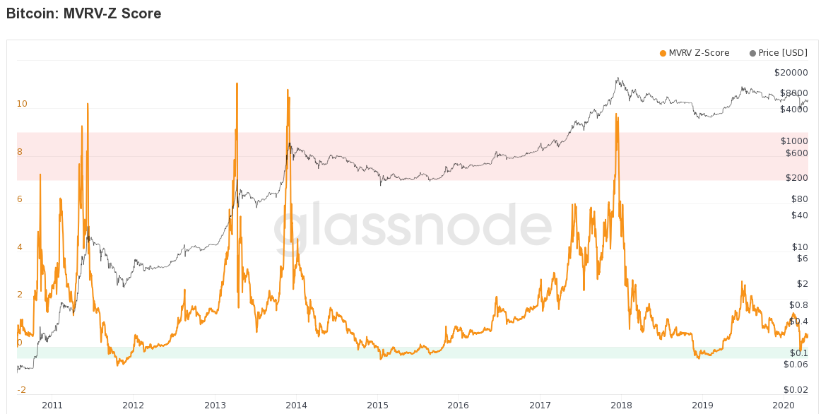 第三个周期期间,随着比特币价格不断上升,MVRV在牛市顶点附近出现大于4(价格被严重高估)的极端情况。之后比特币进入熊市,MVRV在2018年11月至2019年3月的熊市低谷维持在0.7至0.9之间。在04月初突破1,迎来了一轮上涨行情。然而,MVRV最高上升至06月底的2.57后伴随价格回落,特别是在新冠疫情黑天鹅的作用下,该值短时跌破1后快速反弹至1.3左右。虽然目前比特币价格已处于历史上的较低水平,但不排除二次探底的可能(MVRV可能会再次跌至1以下)。