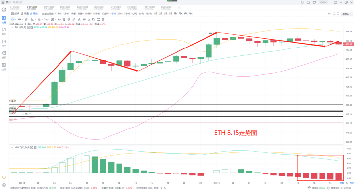以太昨日的思路上选择继续耐心拿着,等待430再次破位能否迫近17高点。那么本日行情以太直接走上了440,就算眼下回撤也是企稳在430之上了,所以别着急,思路上继续保持持有,关注两个位置,一是430支撑,二是440破位,采取小利润博区间的思路即可。