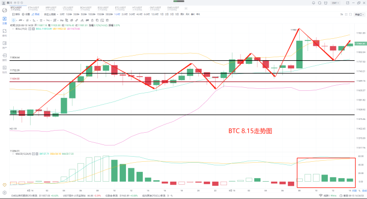 比特币昨日点明思路肯定就很简单了,继续持有现货和合约,耐心等待11800-11900企稳情况再做决定。那么本日的比特币已经走上了11980.眼下回撤也企稳在11800之上,按道理是需要继续持有的,但奈何11980也就一万二这个位置适中无法上攻,久攻不破自然会有回撤的,所以选择提前止盈,关注日内再次上攻失败则空单跟进保持100-300U的小利润离场,底部继续多单介入即可。
