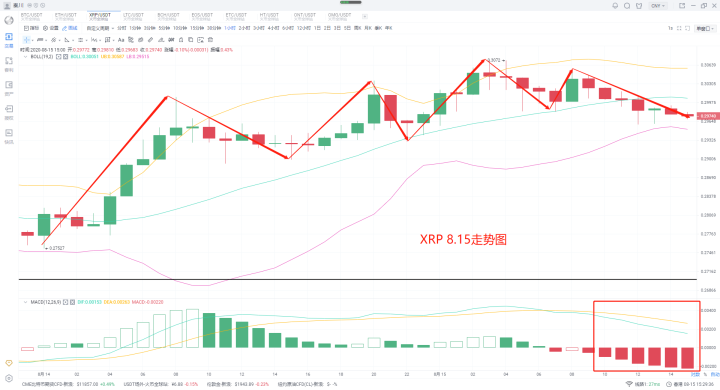 瑞波昨日继续耐心持有就好了,关注能否上攻到0.31这个位置。那么昨日到本日的瑞波别说0.31,始终卡在0.3震荡,并且还是弱势行情,这样的情况之下,也就需要保守,多单止盈,暂停入场,关注大盘动向在做决定。