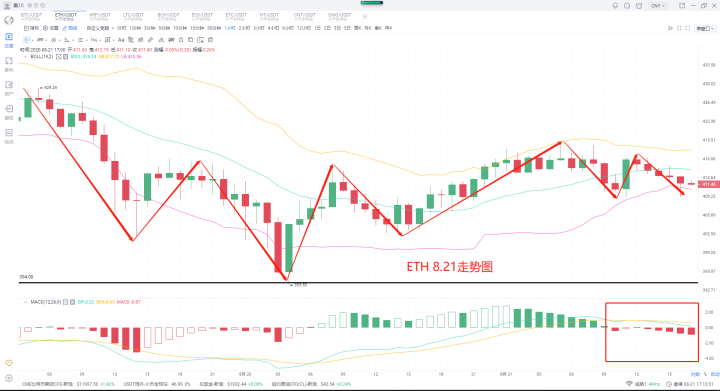 以太昨日思路上选择耐心持有,关注410日内能否反攻在做止盈的打算。那么昨日延续到本日行情还是卡在了410之上,这里倒也不用多说什么,日内关注行情能否企稳410,一旦跌破止盈离场,转变为定投390 380 370定投多单进场即可。