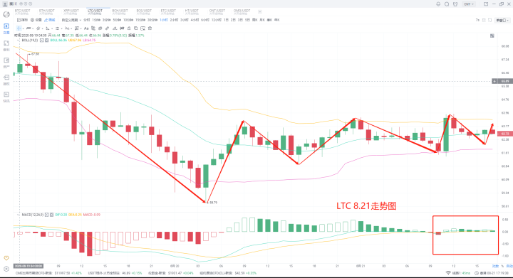 辣条昨日思路上选择继续持有关注63这个位置能否企稳在做打算。那么昨日延续到本日并未出现企稳的动作,这里也就不着急了,直接安排定投在58 54 50三个位置多单跟进即可。