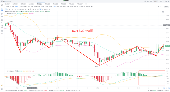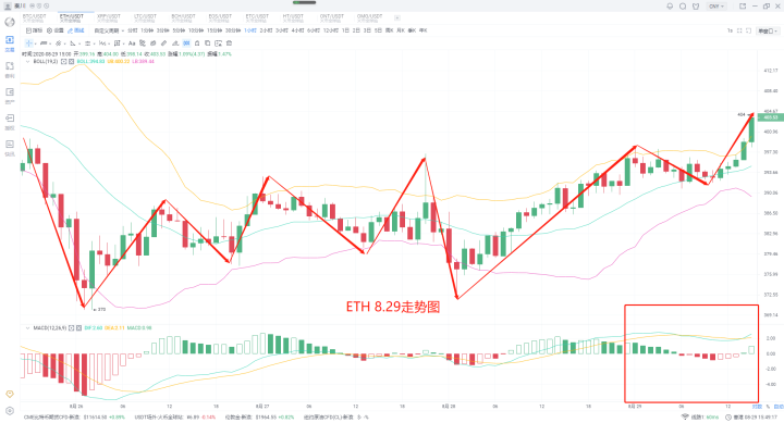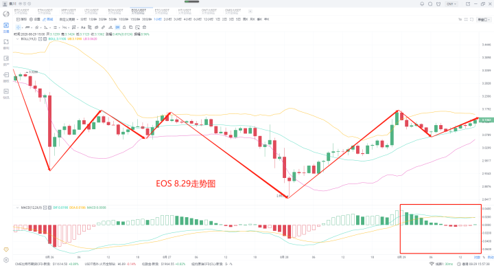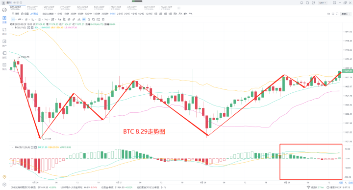 昨日大盘思路上说明低多未进场的不要着急,有的是机会,耐心等待即可。那么本日的行情到没有太大的变化,盘中小幅度上涨之后,企稳在各币种的关键的位置,也并未形成连续性的上涨,并且最为关键一点,市场之中处于萎靡状态,尤其是量能方面,这也连带导致了当下市场之中观望情绪的加剧。另外一块,消息市场之中也没有太大的动静,眼下有用的反而是几个数据。8月26日的稳定币供应比率(SSR)指标,链上监控资源Glassnode预测比特币/美元将上涨。稳定币供应比率比2019年7月“强3倍”SSR是指稳定币对比特币的潜在购买力。较低的比特币价格允许稳定币所有者(例如在交易所)购买更多的比特币。这种需求推高了比特币的价格,因为比特币的供应是可预测的、可验证的,而且存量与流量的比率很高。随着比特币的价格上涨,稳定币可以购买的比特币数量会减少。获得比特币头寸的能力称为“购买力”,目前,购买力很高,这意味着稳定币所有者可以购买相对大量比特币。包括比特币市值占比在震荡萎缩。据TradingView统计,截至8月27日,加密市场总市值为3426亿美元,其中比特币市值占比为61.35%,而在8月16日,这一数据仅为60.4%,刷新年内新低。反观比特币价格,据OKEx行情显示,比特币在7月底一举突破1万美元,8月延续涨势,顺利突破12000美元,刷新12个月内新高,与比特币市值占比持续降低的事实形成鲜明对比。这一系列都说明了当下市场之中的状态,所以不要着急,耐心等待。