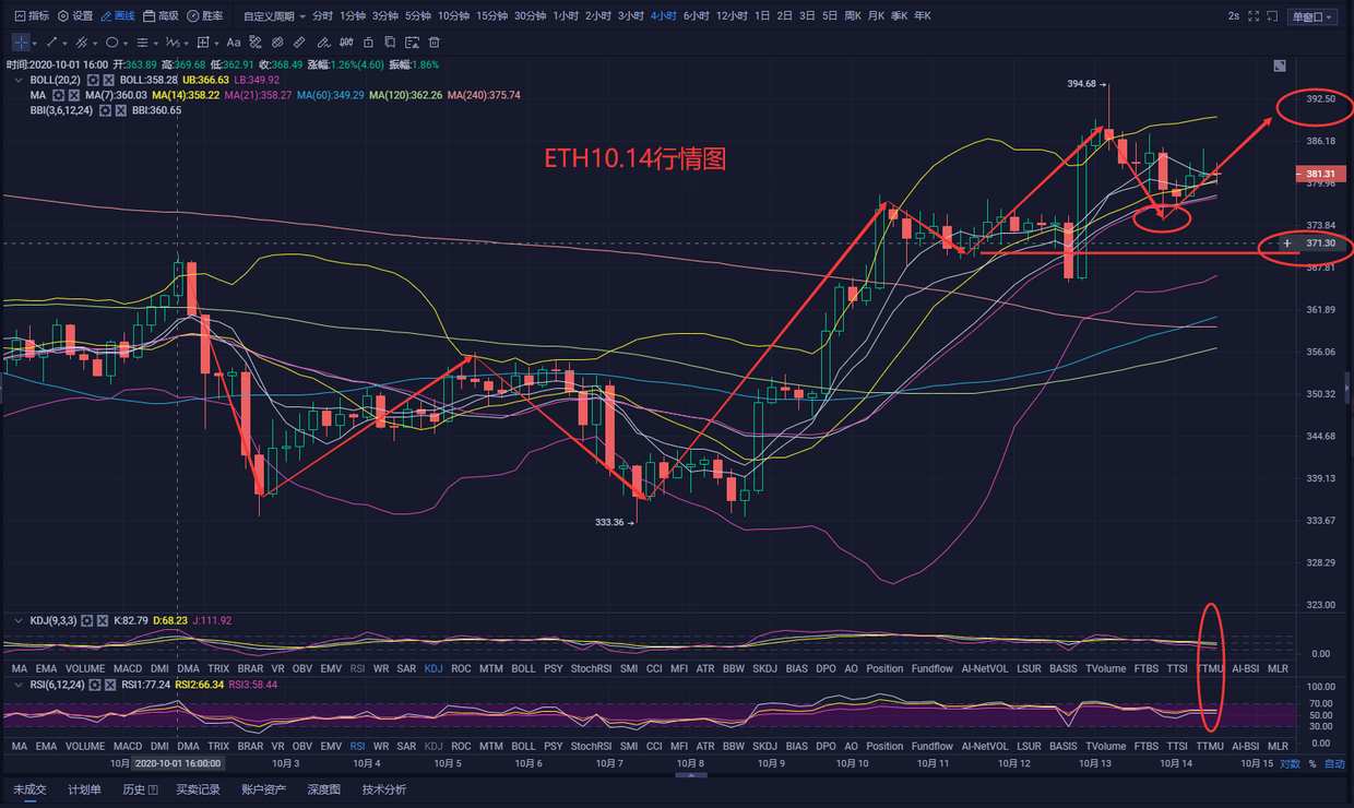 以太在昨日持续一路冲高后,最终走出了震荡修整阶段,这里跟大饼类似,那么本日操作思路上保持不变,跟昨日相同,耐心等待即可。多单方面则定局在375美金附近,二轮追加点定局在385附近,空头方面逐步定局在400美金之上。下方支撑位关注360美金,上方第一压力位暂且关注400美刀,第二压力位关注420美刀即可。