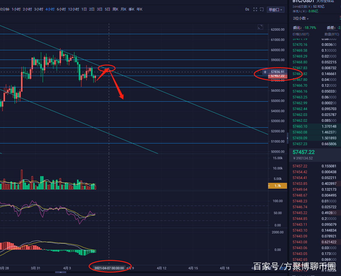 更何况比特币现在K线中(57000)有一个价格支撑,但是跌破这个支撑只需要小时空信号给出反馈,随后就会进行小时空和四小时的空,一但形成共振,那么比特币价格又至少会继续下跌2000美元,上方位置最好是在(57800)左右