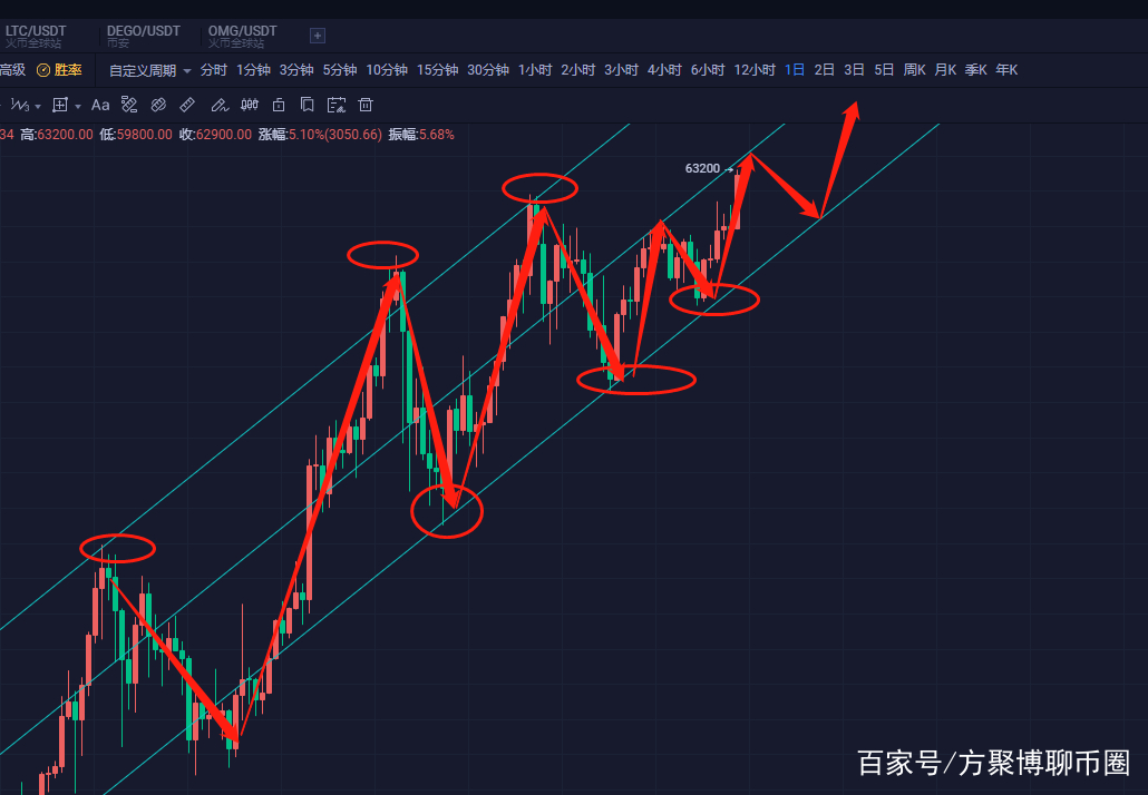 比特币日线上行通道完整,每一个高点与低点都高于前面,盘旋一天在晚间拉到(6300)打破新高,目前盘整肯定是存在,今日晚盘给空头想法,目前可以向下看到(61200)附近离场。高点已到,可以干进去了,夜间可以随时关注作者私。