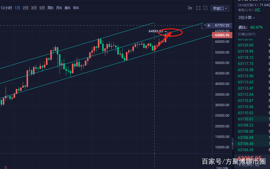 比特币这几天重点关注顶底转换的支撑63000附近,后市如果站不稳的话就会去试探下方60000的支撑位。正如日线图所表示上行通道中轨压力上升至64450,可以围绕底部支撑63000位置做多,主要关注64000是否有回落的迹象,防守在62700,破位多单不再持有表示底部转顶部,改变思路转持有空,首要关注日线的61400第二高点位置,防守63200。后续想跟的朋友可以关注老方私,只要行情稳定每天尽量带大家吃肉。