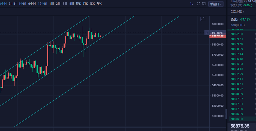 比特币没有效跌破价格通道中轨的情况下还是可以干多进去的,(58600)为试探低位可以尝试多。随着比特币交易越来越大众化,许多不法团伙也在用比特币作为交易货币,这势必会影响大局,这些不铲除也难以继续被人们看好上攻八万,下一次的进化与升华就会成为比特币之年。