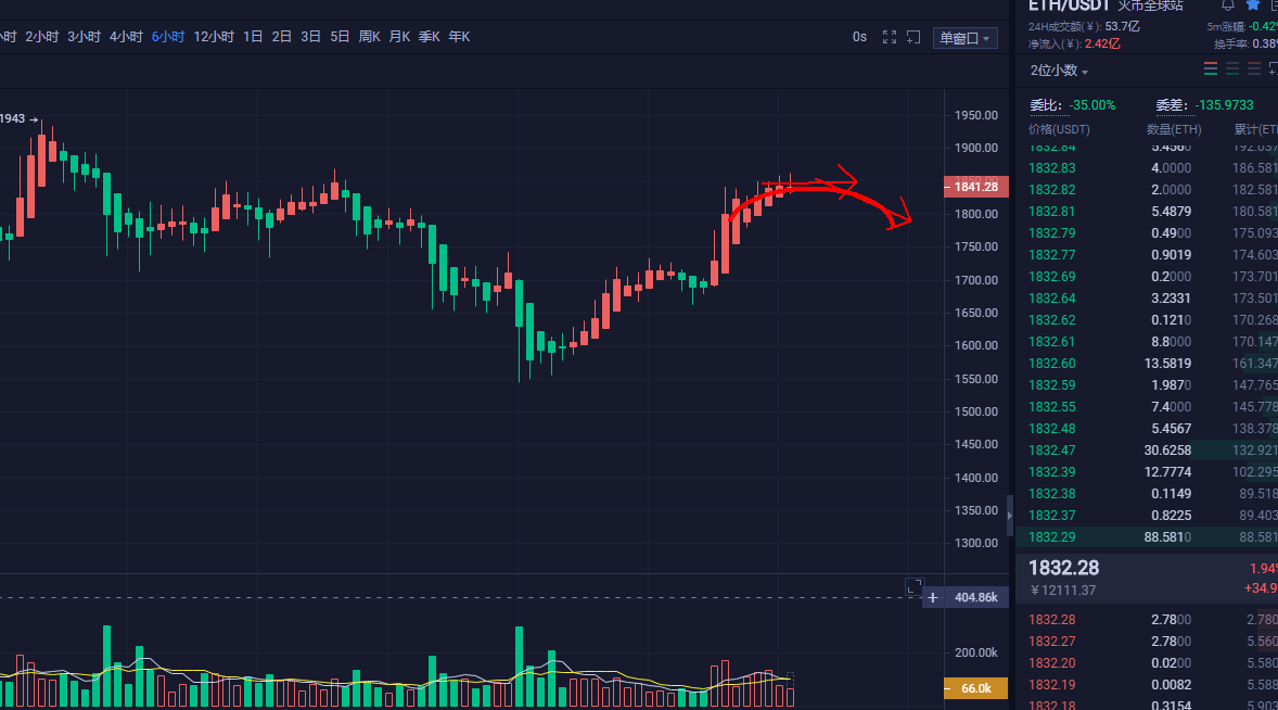 小时线来看,币价在布林带上轨三次触及顶部,上行的趋势在减弱,1860一线刚好是前期下跌的高点位置,现在面临突破这一新高,主力肯定要震荡消化追高的筹码。六小时线圆弧顶逐渐形成,所以白盘以太坊应该会处于震荡上移至1840-1845区间。技术指标KDJ死叉向下发散,MACD横盘向下移动,重心偏下,操作上建议反弹高空,位置处于1840附近,首个目标关注1800。
