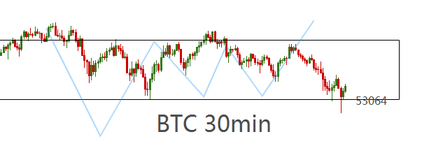 今天早上已经跌破53064,最低点52651。按照推演1,这里将会反抽回黑框中,情况好一点的话,突破上沿,做出底部反转形态。情况差一点的,突破不了上沿,在内部震荡一下,跌破下沿,继续下行。(不明白推演1的,可以查看《两种模型的推演看BTC后市》)