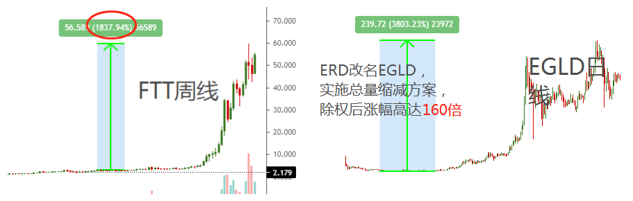 最好的是ERD(后面改名EGLD),这个币特别恐怖,拉盘跟闹着玩似的。从推荐价到8月份就涨了28倍,然后总量缩减1000倍,回调一段后,又涨了30+倍。按照当时推荐的价格算(除权后),获利160倍,私募价更是获利360859倍之多,你没看错。