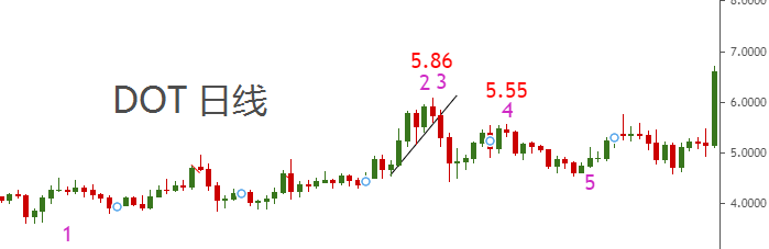 3号位置5.86u反手做空,连吃两波,然后计划在4号位置5.55u加码空单,实际最高点5.556u,最终获利出场,这一单的精彩在于每一个反转点都是提前预告的,而且是准确的。