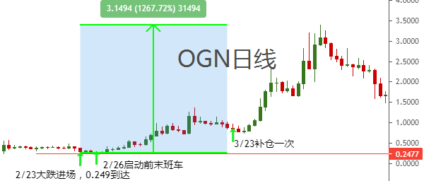 2月20号跟老m聊天,因为他一直持有OGN,所以就把我的交易计划给他看了,里面写的是“建议挂单在0.249”红字标明,当时OGN价格0.38。结果23号大跌,在0.231扎针。看似一根针其实是柔柔的粉拳砸在了我的心上(脸红)