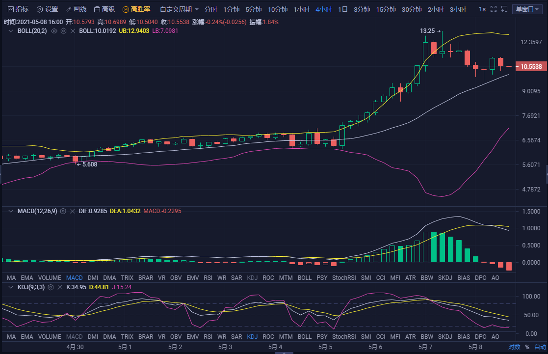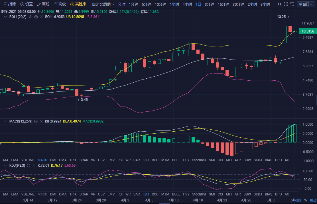 日线图没有看的必要,看完就不相信指标了,没有任何征兆就是直接拉升,看指标就是纯属浪费时间。KDJ黏合拐头向下,MACD量能不断强势,BOLL持续发散,币价创新高之后开始回调,整体来说指标没有任何意义,就会证明了主力赚够了开始画线了。