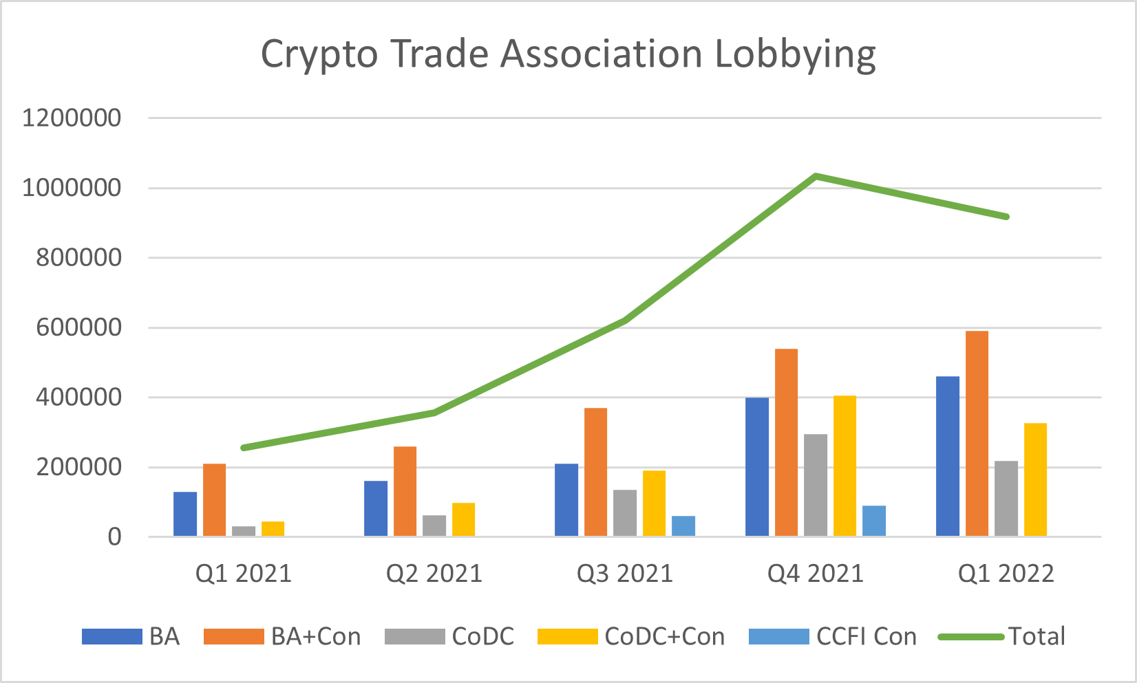 Per Senate lobbying disclosure reports, federal spending by crypto trade associations dipped from $1,034,663 to $917,406 between the last quarter of 2021 and the first quarter of 2022.