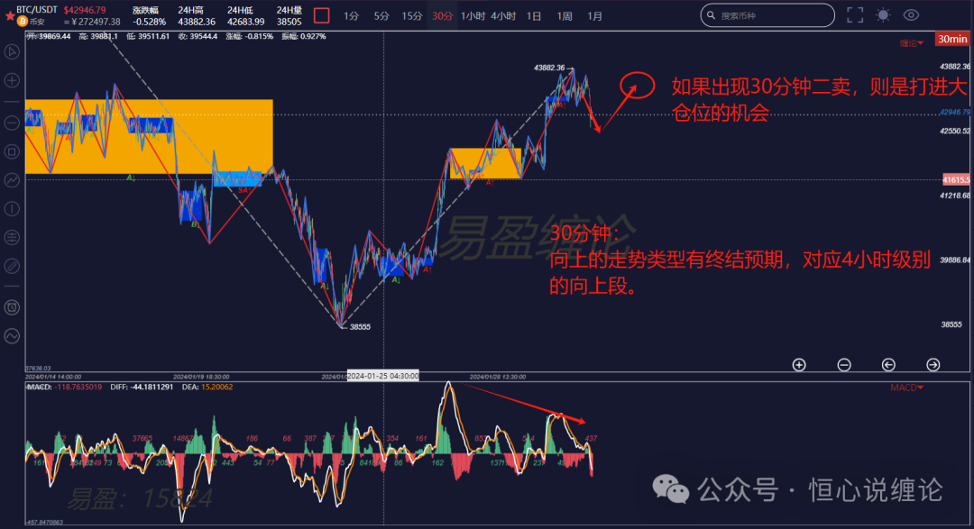 When trading at the large time frame, position management must be emphasized. Large positions must be taken when the trend is relatively clear and opportunities on the right side have appeared. Corresponding to the current market, it is an opportunity for a 30-minute confirmation of a short position, which will probably occur in the next two days.