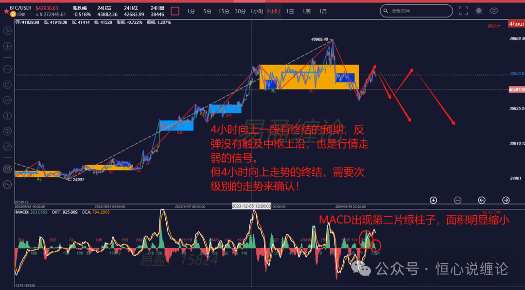 The upward trend can be considered a trend divergence (refer to the previous article). Currently, there is a confirmation of a short position at this level, which basically declares the end of the upward trend on the left side. The right side trend may be a downward trend, or it may only form a larger consolidation before continuing upward (the strongest market situation). Therefore, those entering short positions at the moment must pay attention to the exhaustion signal of the bearish energy at the 4-hour level. Because shorting is riskier than going long.
