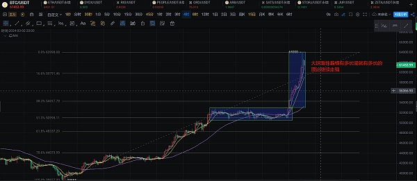 大饼秉性着横有多长竖就有多长的理论继续走强,现在K线组合已经没有参考的意义,全是市场情绪使然。大饼距离历史新高69000 还差5000点,这个月涨幅2万多点,今天是月末最后一天,明天换月线大概率还是延续一个惯性上涨,破新高也只是一瞬间的事,但破新高前会不会像以太一样来一个更深的天地针洗盘一次,就让我们拭目以待了。