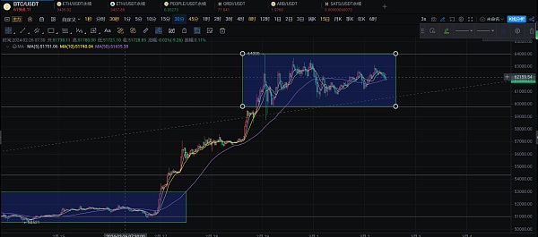 大饼来到64000以后距离历史新高就一步之遥,相对于别的币种来讲大饼的走势可以说是遥遥领先,但是越进阶历史遇到的阻力也就越大,再次创造历史必然需要一个蓄力的过程。大饼目前也是来到了一个高位的调整阶段从下图可以看到价格在箱体内不断的调整,但是可以注意到每次回踩的低点都在不断的走高,支撑位也在升高,这也是一个走强的信号。