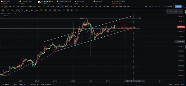 以太经过连续的拉升之后,目前也是到了一个修正的阶段,现在看短期回调还是有需求的,在这个区间内还是会冷静一段时间。昨日回踩3375后再次反弹到3450这个位置,说明下方3420-3380的支撑还是很强,近期还是可以依靠这个支撑位继续上看,那么今日主要思路还是低多也是没有什么问题。