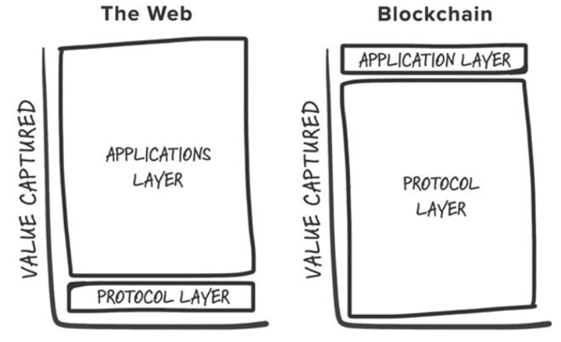 在每个加密周期中,最成功的投资往往是早期押注于新的基础层基础设施原语(如 PoW、智能合约、PoS、高吞吐量、模块化等)。如果查看 Coingecko 上排名前 25 的资产,只有两个 Token 不是 L1 区块链的原生 Token(不包括锚定资产),它们是 Uniswap 和 Shiba Inu。Joel Monegro 在 2016 年首次解释了这一现象,他提出了“胖协议理论”。该理论指出,Web3 与 Web2 在价值积累上的最大区别在于,加密基础层积累的价值超过了其上构建的应用程序所获得的总价值。这种价值来源于: