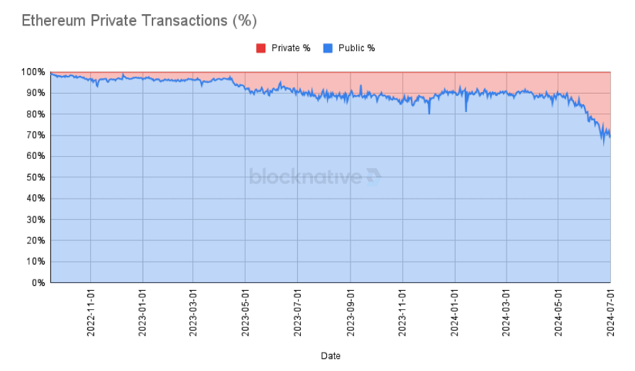 此外,越来越多的交易通过私有内存池进行,这在以太坊上达到了历史最高的 30%。去中心化应用程序(dapps)意识到,用户订单流的价值正在被提取并泄露到 MEV 供应链中,而私有交易则为围绕高黏性用户流的定制化和货币化提供了更多机会。