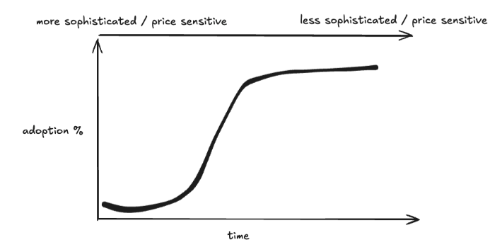 这表明,应用程序中的 Lindy 效应同样存在,甚至可能比基础设施中更为显著。通常,新技术的采用(包括加密货币)遵循某种 S 曲线,随着我们从早期采用者过渡到更广泛的大众用户——下一波用户可能不那么精通技术,因此对价格不太敏感,这使得能够达到临界规模的品牌可以通过创造性(或简单)方式盈利。