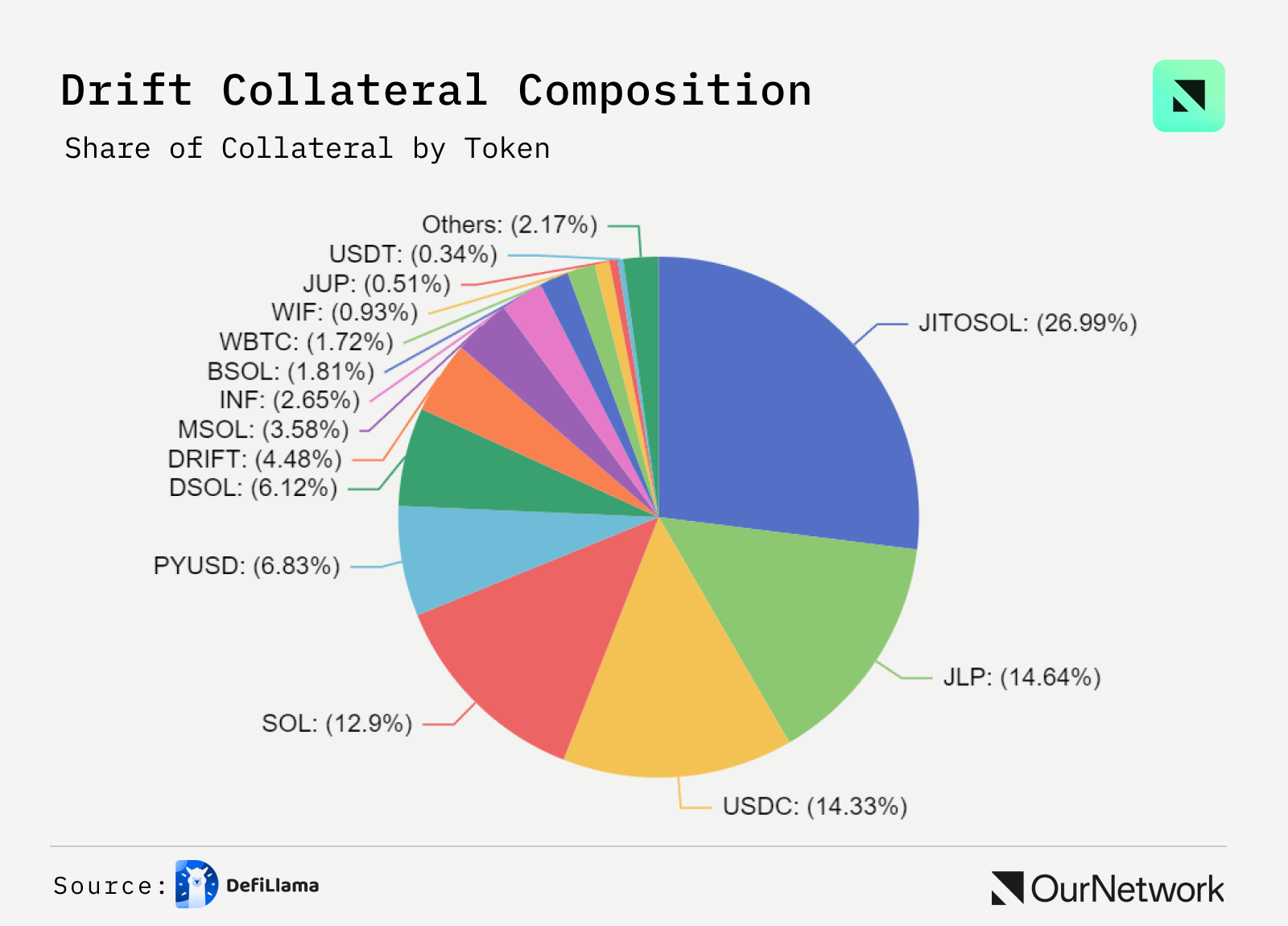 抵押品的构成显示用户对非稳定币交易的高需求,即便投注最终以稳定币结算也是如此。截至 10 月 1 日,Drift 的总锁定价值 (TVL) 中只有 22% 是以流行的稳定币持有,如 USDC、PYUSD、USDT,以及其他如 USDe/sUSDe 和 USDY。