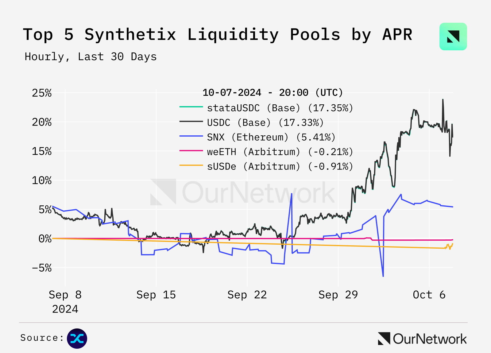 今年九月,USDC 流动性的 7 天平均年化收益率 (APR) 上涨了 300%,在短短几周内从 5% 飙升至超过 20%。这一增长凸显了 Synthetix 生态系统内对稳定收益需求的迅速增长。