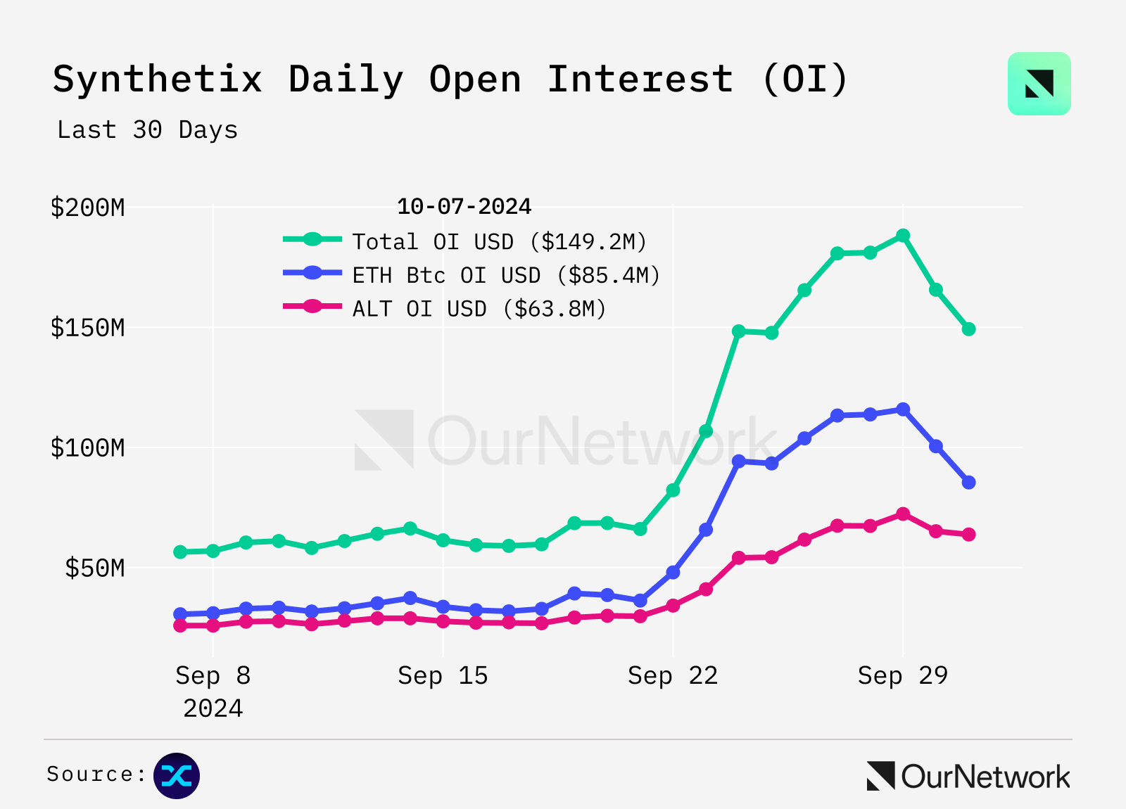 sBTC 和 sETH 的未平仓头寸从 5000 万美元扩大到超过 1.5 亿美元,反映出杠杆头寸增加了 200%。这一增长与 SNX 集成商的交易量增加以及预期的产品发布(如多抵押永续合约)相符。