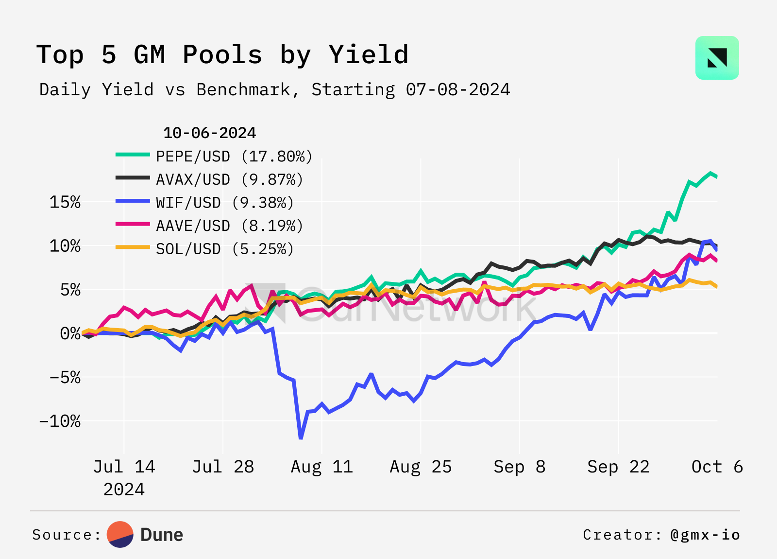 随着许多 GM 资金池的推出,大多数流动性提供者实现了积极的收益增长。过去 3 个月中表现最佳的 GM 资金池,与其基准——持有基础资产——相比,包括 AVAX/USD、PEPE/USD、WIF/USD,分别比其基准上涨了 10%、18% 和 11%。