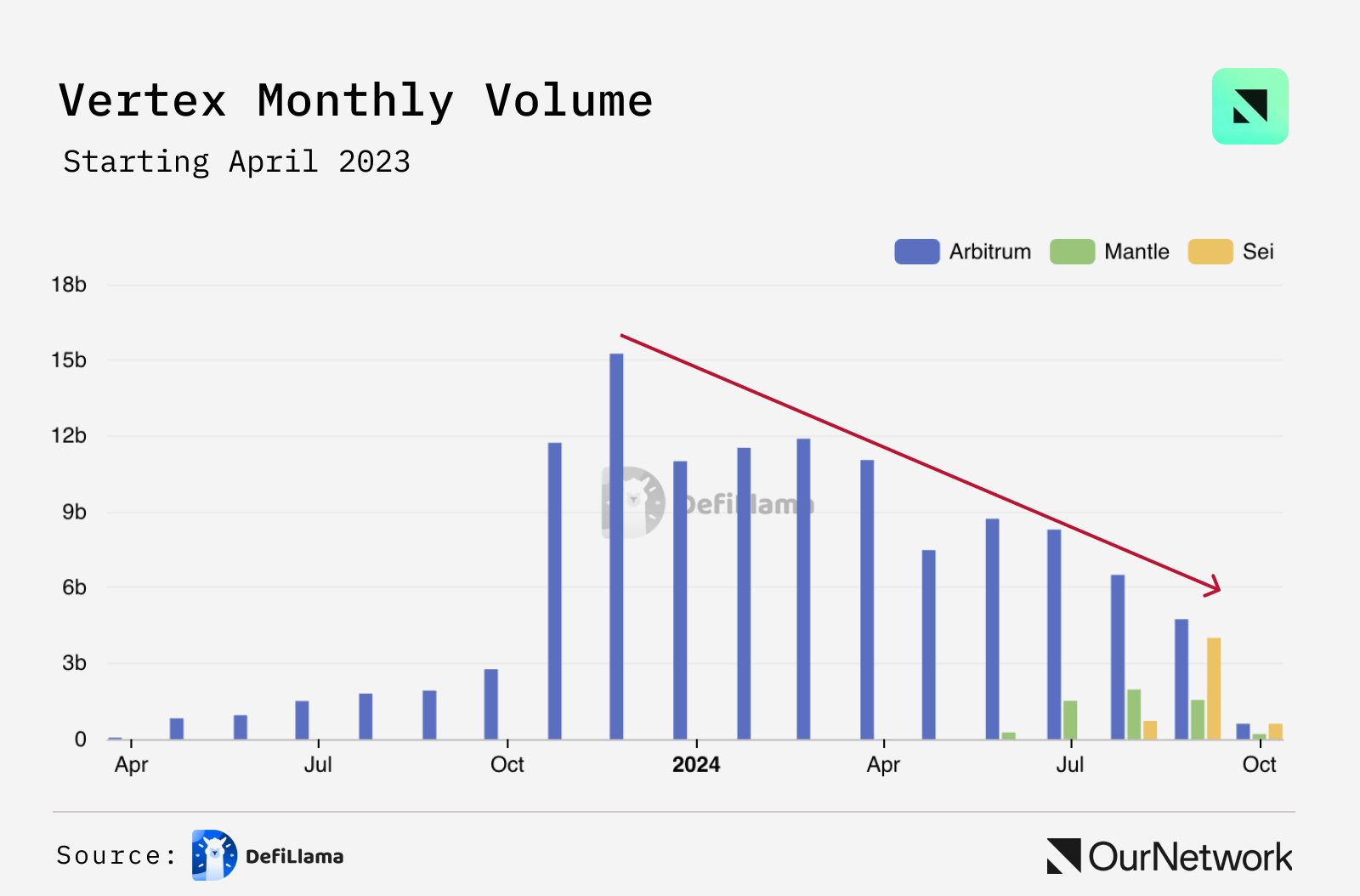 Vertex 是一个提供永续合约和现货交易的平台。尽管平台交易总量达到了 1300 亿美元的新里程碑,但 Vertex 在吸引更多业务方面似乎遇到了挑战。事实上,月度交易量图表显示,从 2023 年 12 月开始有所下降。这尤其令人担忧,因为 Vertex 最近将业务扩展到了其他链,如 Base、Mantle 和 Sei,而最初是专注于 Arbitrum。