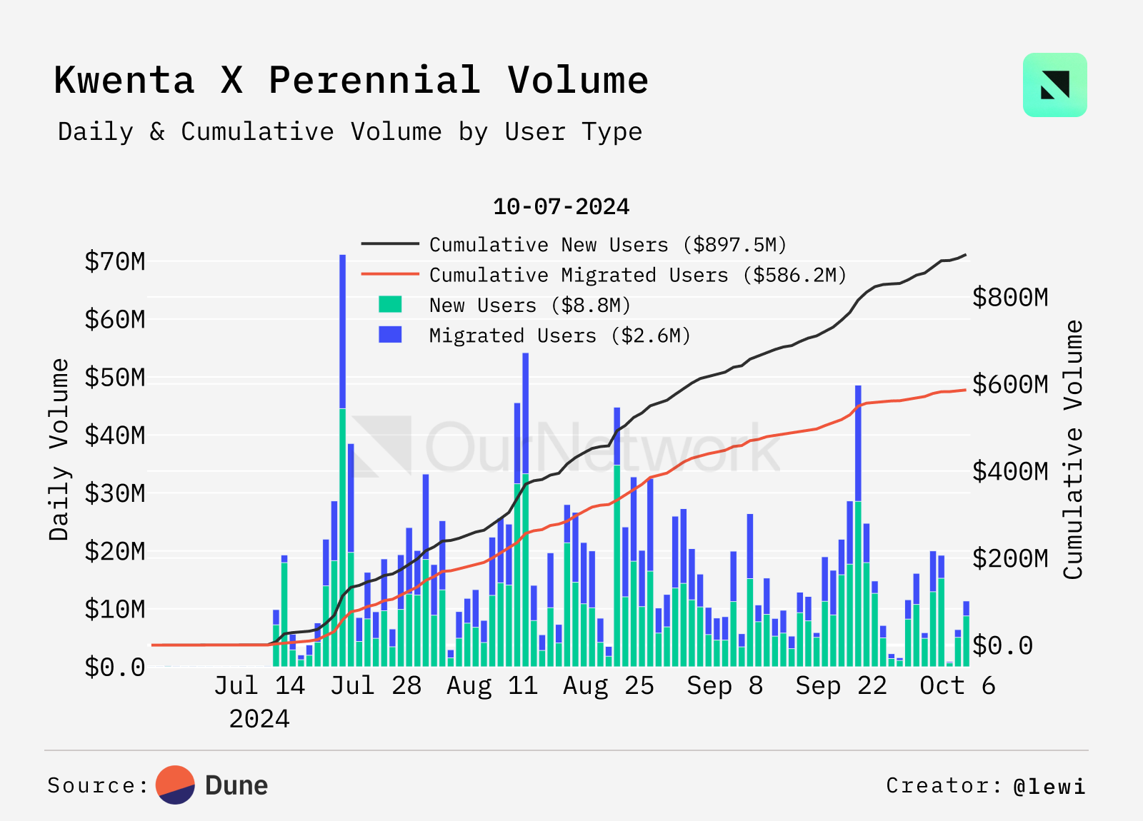 Perennial 提供永续合约交易基础设施,合作的前端可以接入,共享流动性和订单流。当 Perennial 集成新应用时,随着新的用户群体加入交易网络,交易量会增加。最近与 Arbitrum 上领先的永续合约聚合器 Kwenta 集成后,Perennial 达到了历史最高的日交易量。在 7 月中旬 ETH ETF 新闻期间,Perennial 的日交易量飙升至 4400 万美元以上,因为做市商对其波动性赌注进行了 delta 对冲。