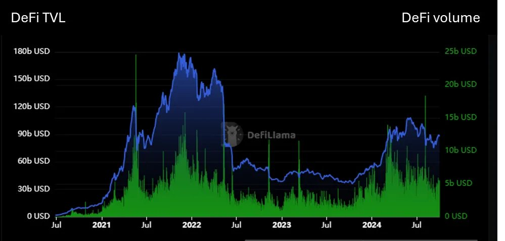 After two years of adjustment, key metrics such as Total Value Locked (TVL) are rebounding, as shown in the chart below. While the rise in cryptocurrency asset prices has improved some metrics, the trading volume on DeFi platforms has also significantly increased, nearly returning to 2022 levels, proving the authenticity of the recovery.